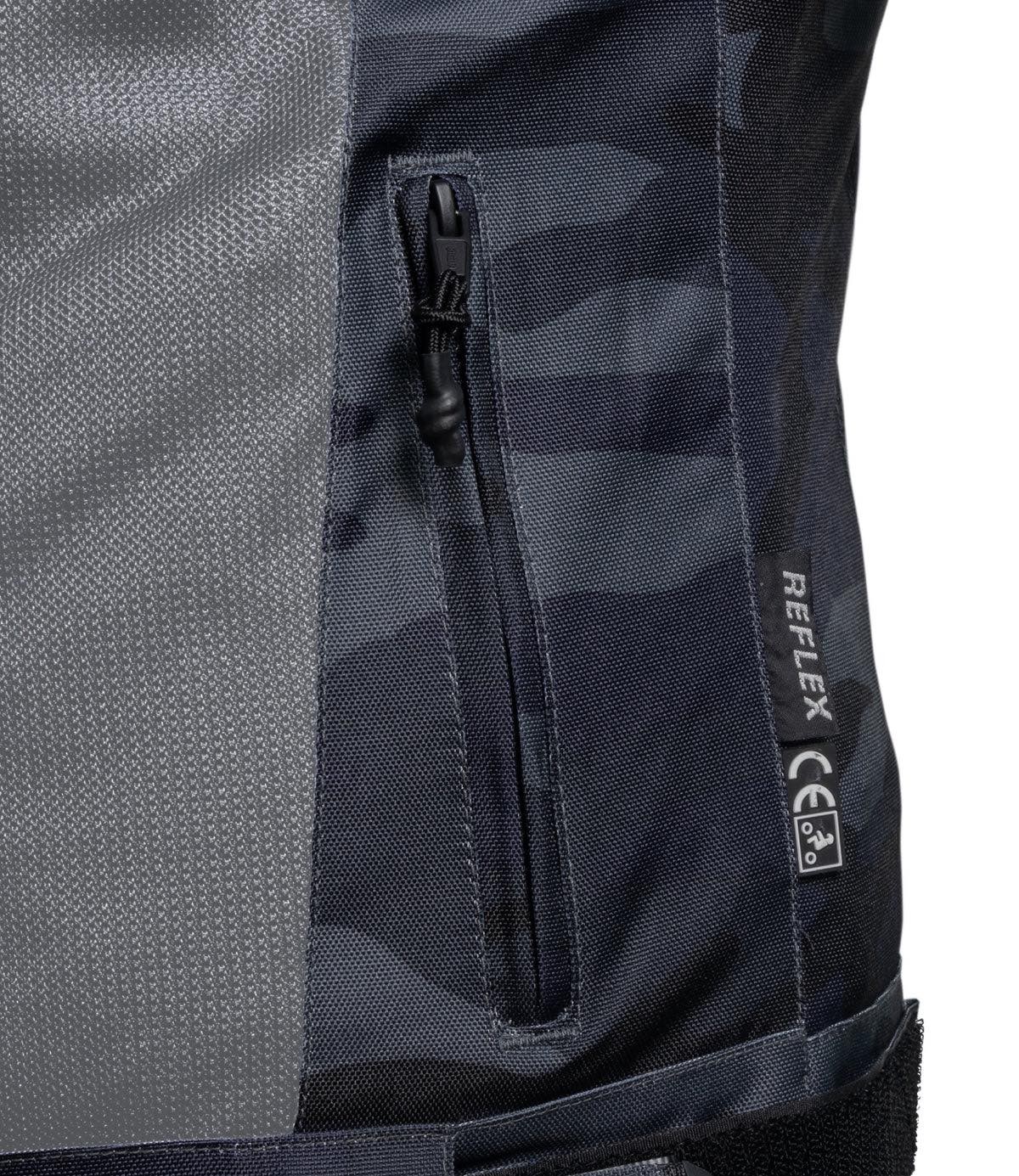Camo Pattern: Woodland camouflage pattern on the outer shell in blue, black and grey